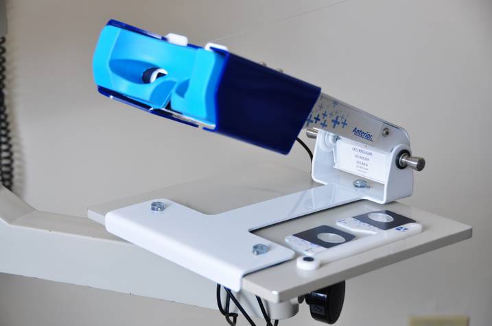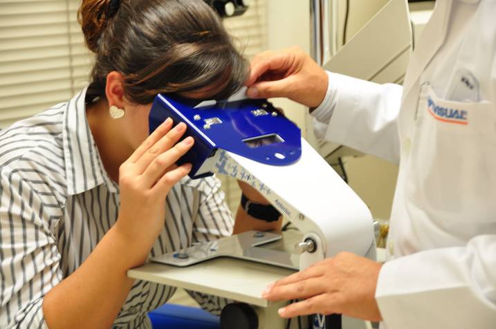 Visualómetro óptico que determina de manera subjetiva la medida entre los ejes visuales, vital para la adaptación de lentes multifocales en pacientes présbitas, porque se establece con precisión la medida donde se debe ubicar el área del lente por donde el paciente pueda ver con comodidad para leer y a diferentes distancias. Consta de una base que facilita la ubicación del visualómetro en cualquier mesa, acondicionado con chupas, con eje abatible, que sostiene el cuerpo, frente al que el paciente ubica su cara en la máscara , tomando postura similar a la de lectura, y sus ojos quedan a 14 milímetros de cada agujero. Cuando acciona las diales de forma manual el paciente visualiza una imagen ubicada en la pantalla de manera monofocal, limitado por un oclusor y permitiendo ver a través del limitador visual el objetivo en pantalla . El visor LCD muestra el resultado del desplazamiento de cada eje con respecto al centro del puente nasal y da la distancia total compensada en 5 mm para visión lejana.